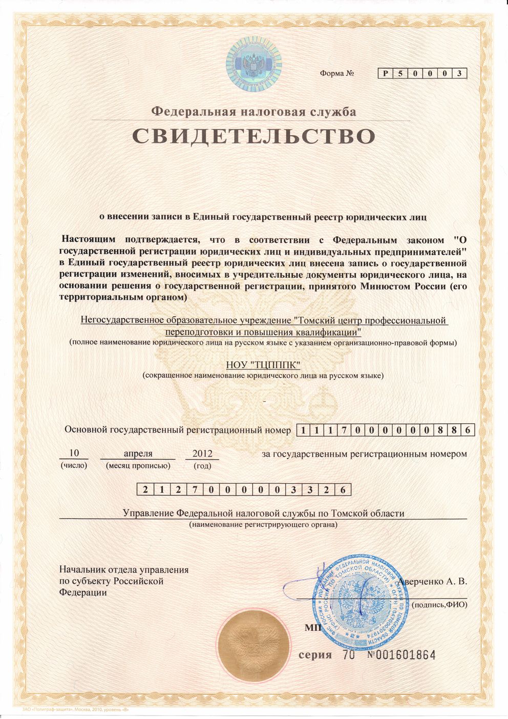 Свидетельства о постановке на учет, о регистрации некоммерческой организации, и о внесении записи в Единый государственный реестр юридических лиц